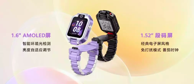 5X Pro在可拆卸基础上推出了双面屏设计——这是儿童手表市场中的第一支双屏产品:主屏幕为1.6英寸AMOLED屏幕,副屏幕为1.52英寸段码屏,也就是经典的黑白电子屏,使用副屏时,电子手表自动开启免打扰模式。