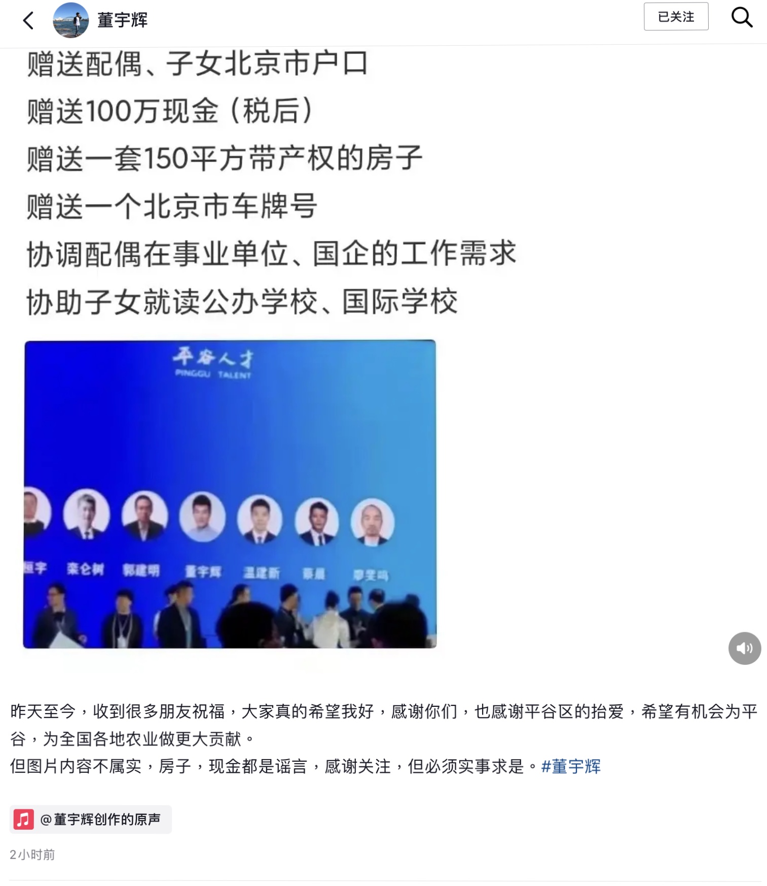 董宇辉同样在社交媒体辟谣:“昨天至今,收到很多朋友祝福,大家真的希望我好,感谢你们,也感谢平谷区的抬爱,希望有机会为平谷、为全国各地农业做更大贡献。但图片内容不属实,房子、现金都是谣言,感谢关注,但必须实事求是。”