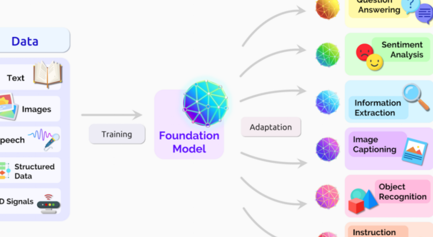 上图展示了基座模型的结构,基座模型集中化了多模态数据,并且可以适配多元化的下游任务。