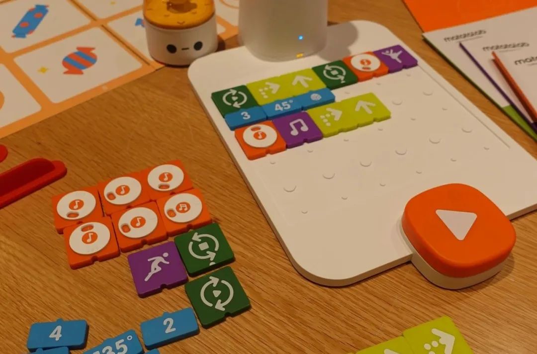 其中,实物编程机器人套装由机器人、控制塔、编程板、编程块四个主件,以及场景道具和扩展包组成。孩子只需确定任务目标后在编程板上运用积木式的模块放置前进、后退、转弯、循环、函数等指令,机器人即可在地图上进行对应行动,所编即所得 。