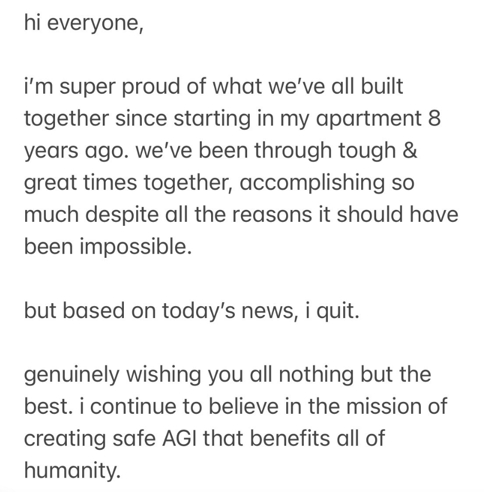 真诚地祝愿你们一切顺利。我仍然坚信创造造福全人类的安全通用人工智能的使命。