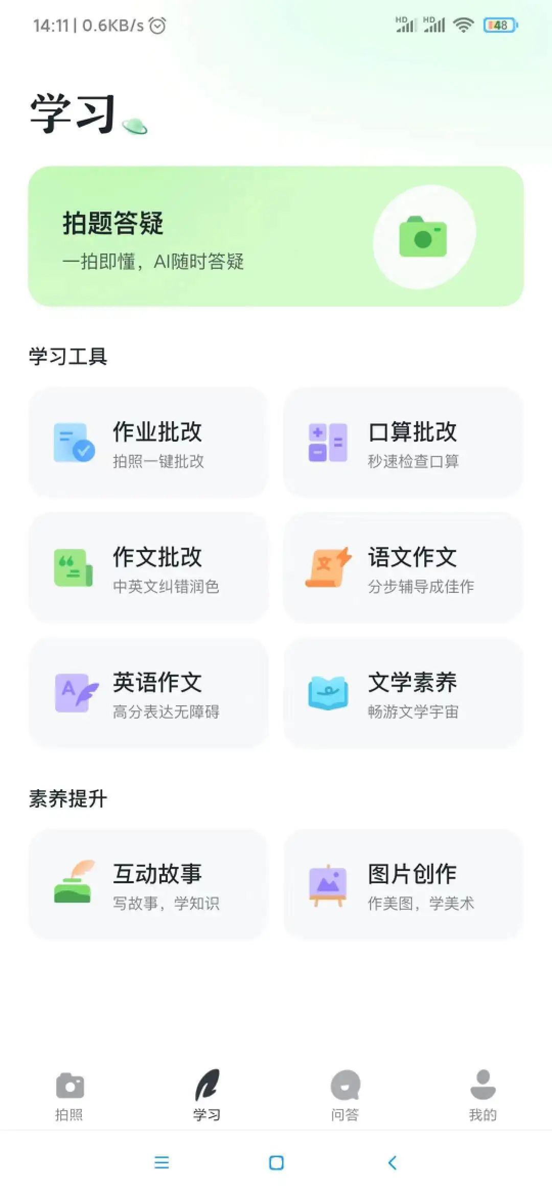 在“学习”页面,河马爱学将拍题答疑功能置于顶部,接着提供了作业批改、口算批改、作文批改、语文作文、英语作文、文学素养六个学习工具和互动故事、图片创作两个素养提升工具。