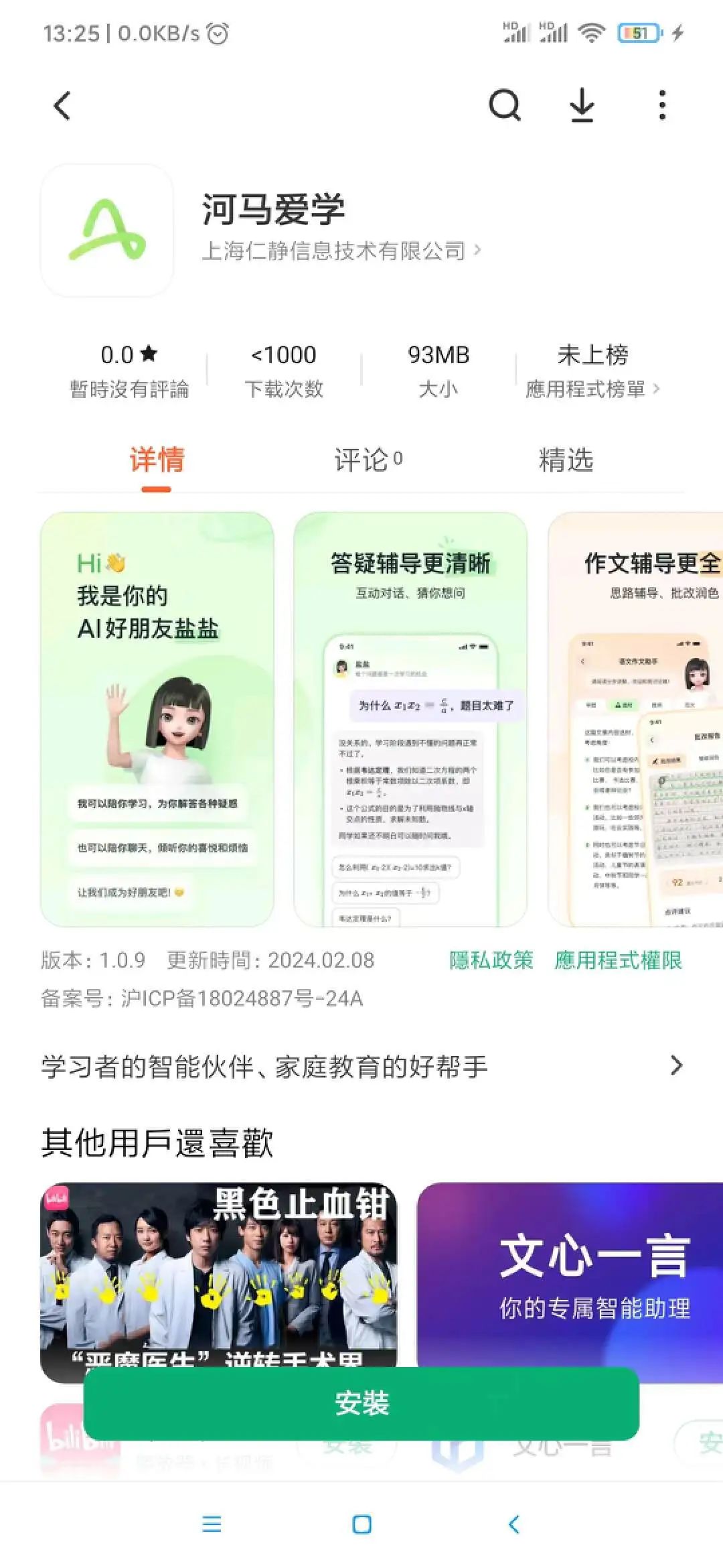 根据应用商店信息,河马爱学App上线于2024年1月,开发者为上海仁静信息技术有限公司。根据企查查显示,该公司法定代表人为李学,控股股东为字节跳动旗下的北京比特智学科技有限公司。
