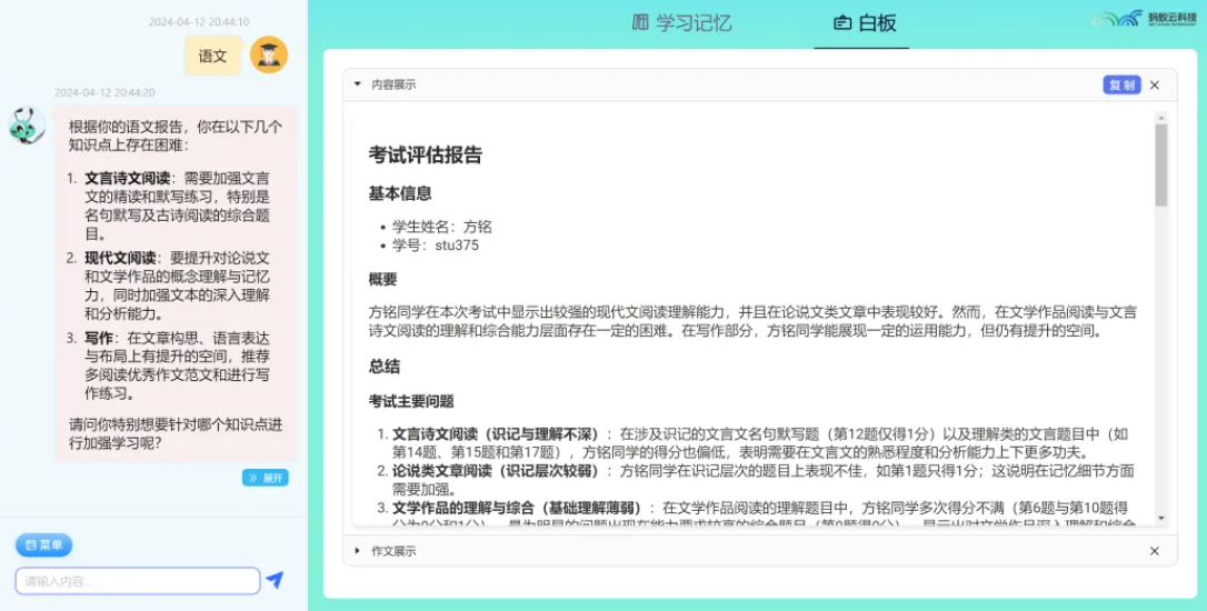 助教Agent,依托教育业务模型,生成详尽的分析报告,分析学生的测验表现、题目正确率、知识点的掌握情况以及能力层次的发展状况。有助于教师全面了解学生的学习情况并个性化教学。