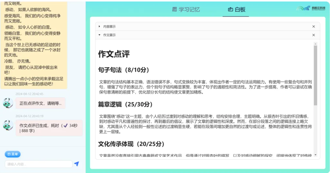 以正大模型还展示了作文辅导及批改功能,能根据学生所处年级、阶段,给作文一个符合实际情况的、引导性的评价。