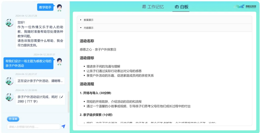 在教案Agent演示中,以正大模型以比人工提高百倍的速度生成了一份涵盖教学目标、教学难点、教学重点、7个教学环节等内容的教案,注重教学目标的明确性、内容的系统性、方法的多样性、学生的主体性、评价的全面性以及教学的反思性。