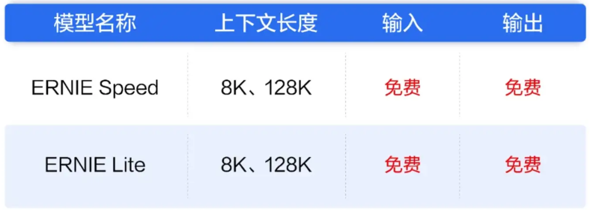 而百度智能云直接在官方账号宣布,文心大模型两大主力模型ENIRESpeed、ENIRELite将全面免费全面免费,上下文长度为8K、128K。