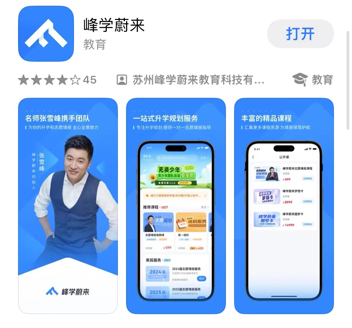 峰学蔚来是由张雪峰打造专门提供高考志愿填报服务的App,在该App中,目前张雪峰高考志愿填报服务共分为三档,分别对应不同阶段的高中生,其中2026届收费最低,8999元起。2024届服务分为11999元的梦想卡和17999元的圆梦卡。