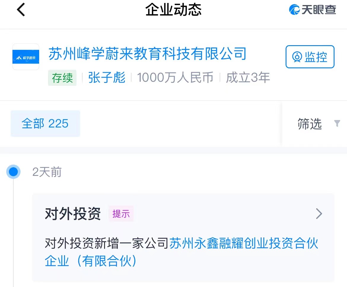 多知7月16日消息,天眼查信息显示,苏州峰学蔚来教育科技有限公司(以下简称“峰学蔚来”)7月11日新增对外投资,被投资企业为苏州永鑫融耀创业投资合伙企业(有限合伙)(以下简称“永鑫融耀基金”)。峰学蔚来认缴出资额1600万元,投资比例为2.6667%。
