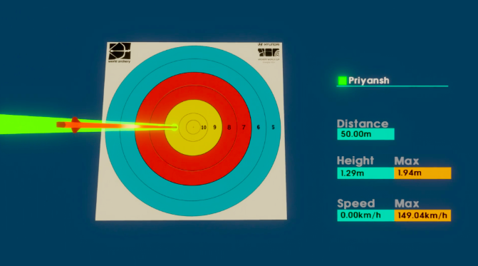 但实际上,箭矢运动中的过程也很重要,却往往缺乏相应的转播语言。在射箭运动中,箭矢在离弦一刹那,会受到弓弦弹力影响而发生动态弯曲,并导致在飞行过程中像鱼一般左右摆动。刮风、下雨等天气变化,也会影响箭矢的运动姿态。箭矢的最终飞行轨迹,决定了能否命中靶心。准确感知风速、精准掌握力道,才能以最佳的最高点离地距离、速度和飞行距离这些关键技战指标,制胜赛场。这些指标也能很好地反映一名运动员的水平、技术特色、发挥稳定性,以及面对不同环境的技战术灵活性。