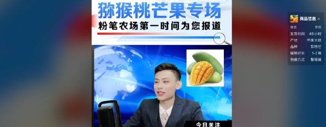 在8月29日开播当天,一名男主播以新闻播报的形式循环介绍了两款农产品:四川攀枝花凯特芒和陕西徐香猕猴桃。