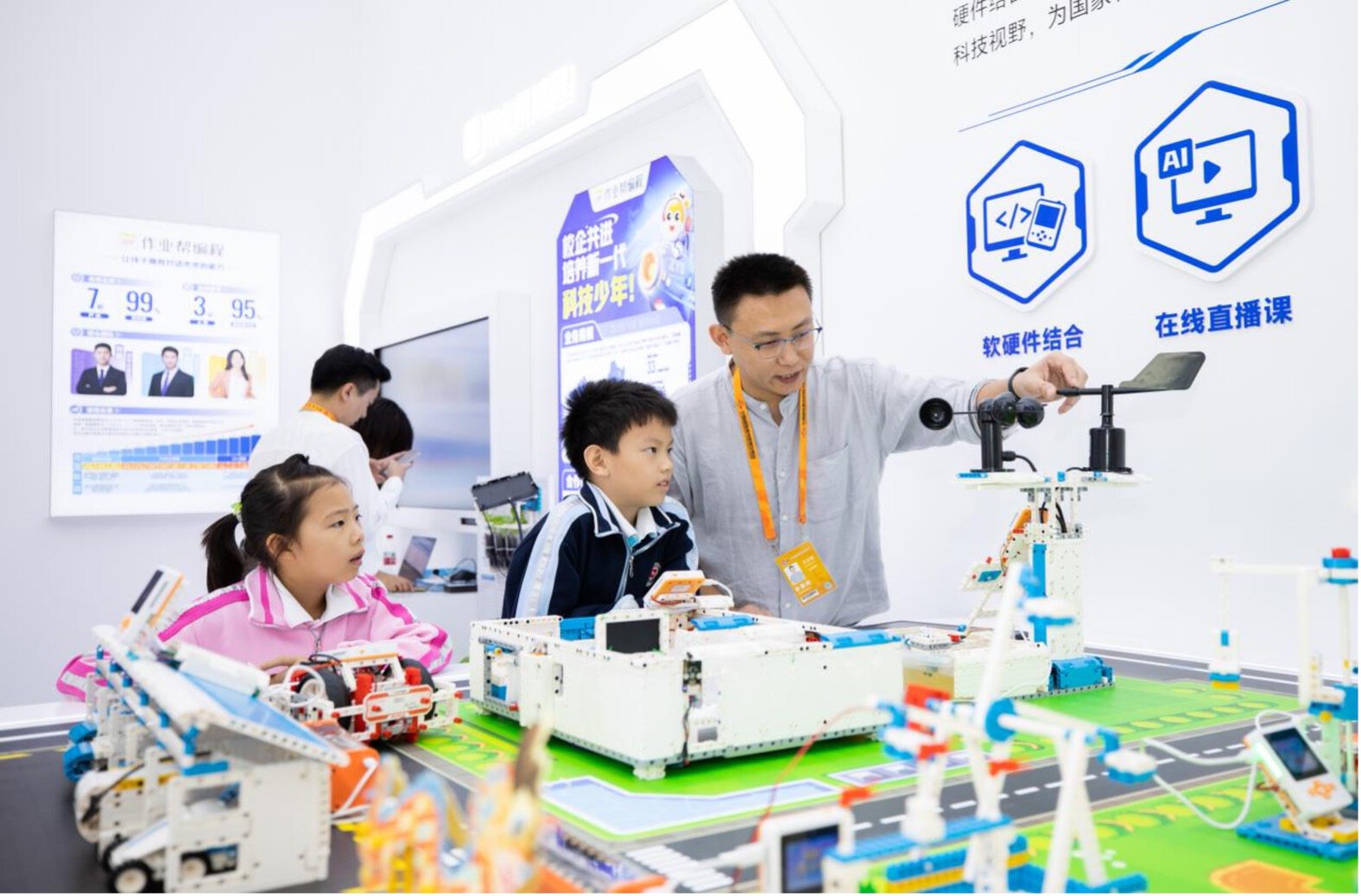 作业帮编程一直探索的人工智能、物联网与编程相结合的科创课程在此次服贸会现场展示了包含智能停车场、智能家居、智慧农业、物联网气象站的智慧城市AI编程科创项目。