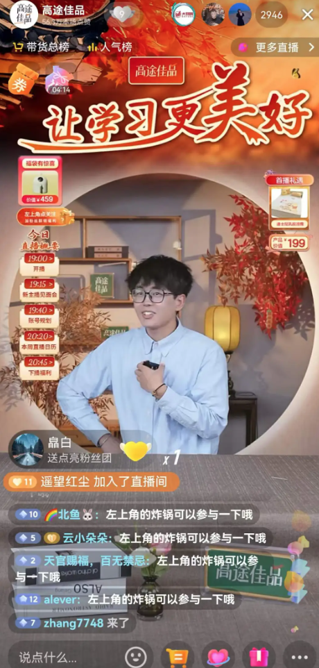不同于两年前的第一次开播,这次复播,陈向东并没有来站台。当天出镜的主播是浩天、少雄和苏苏。浩天表示会每周在高途佳品至少上播一次,而大部分精力则放在其个人IP教育账号上,少雄和苏苏则是高途佳品目前的常驻主播。