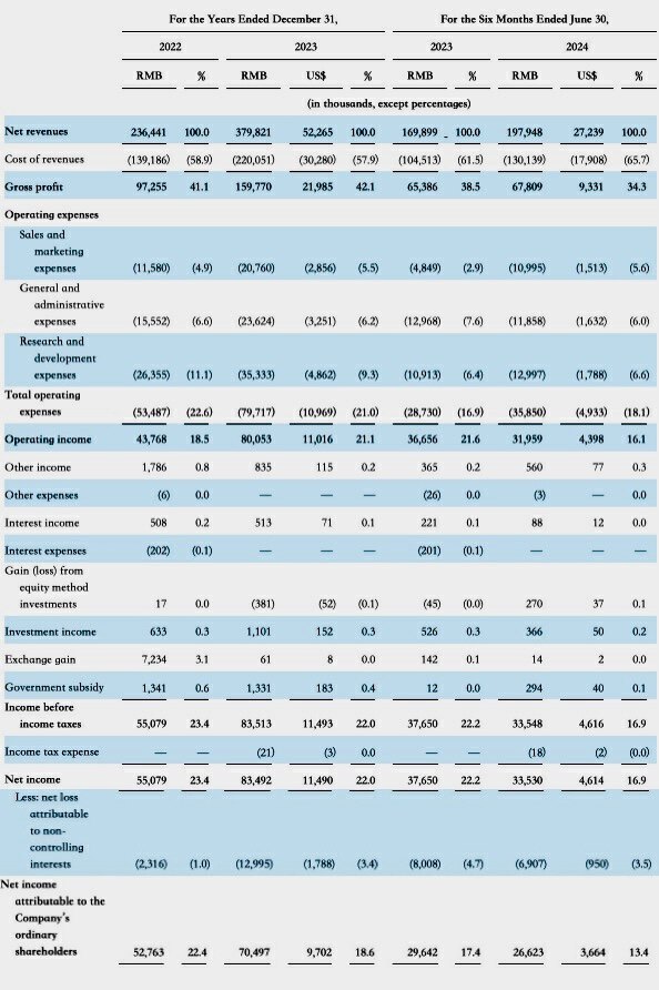 “此外,2022年和2023年以及截至2023年6月30日和2024年的六个月,我们的净收入分别为5510万元人民币和8350万元人民币(1180万美元)、4040万元人民币和3590万元人民币(490万美元)。”