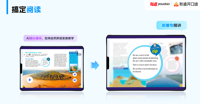 针对阅读,产品配套提供全套《牛津英语话中国》分级读物精讲内容,通过AI指尖查词功能和老师讲读的配合,帮助理解不同难度的文章内容;
