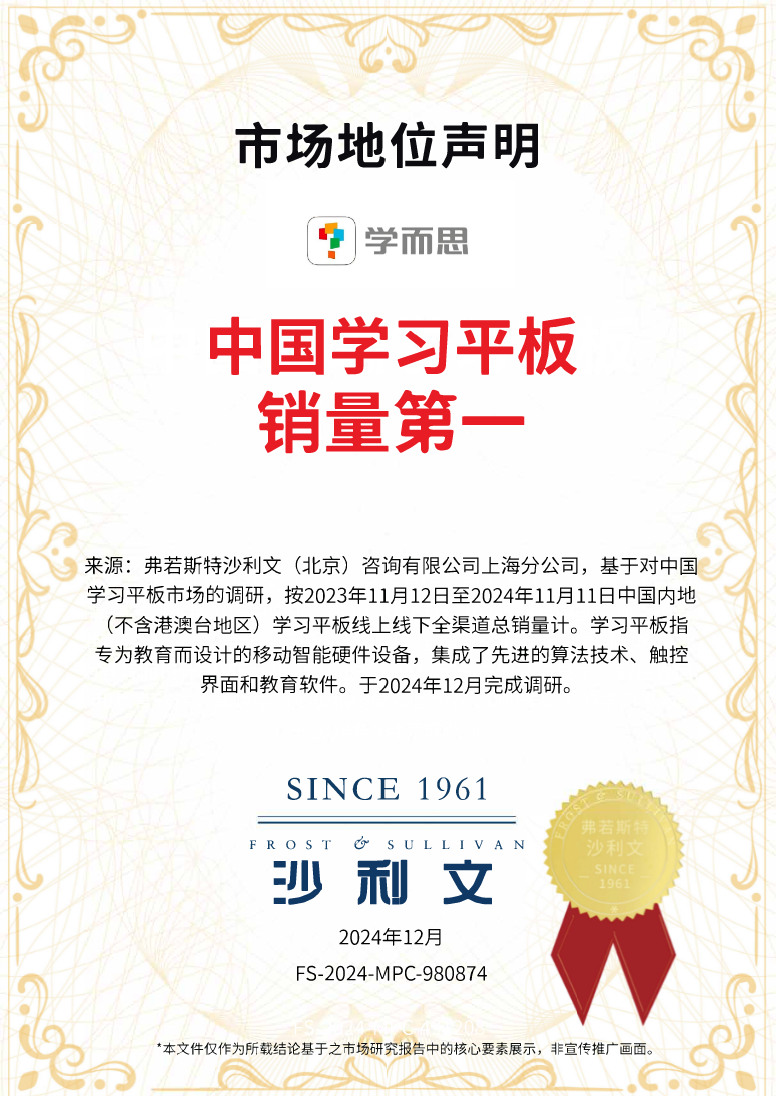 多知12月20日消息,近日,全球顶尖研究及咨询机构弗若斯特沙利文(Frost & Sullivan)授予学而思“中国学习平板销量第一”的市场认证。基于对中国内地学习平板市场的调研,学而思在过去一年(2023年11月12日至2024年11月11日)中销量领先,成为中国学习平板市场的领军品牌。