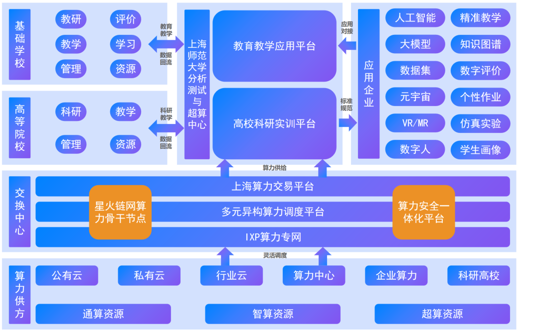 上海教育智算服务平台以国家(上海)新型互联网交换中心为底座,通过打造教育教学应用平台、高校科研实训平台,将教育行业模型应用生产企业、基础教育学校、高等院校、科研院所高效衔接起来,平台具备以下特点:
