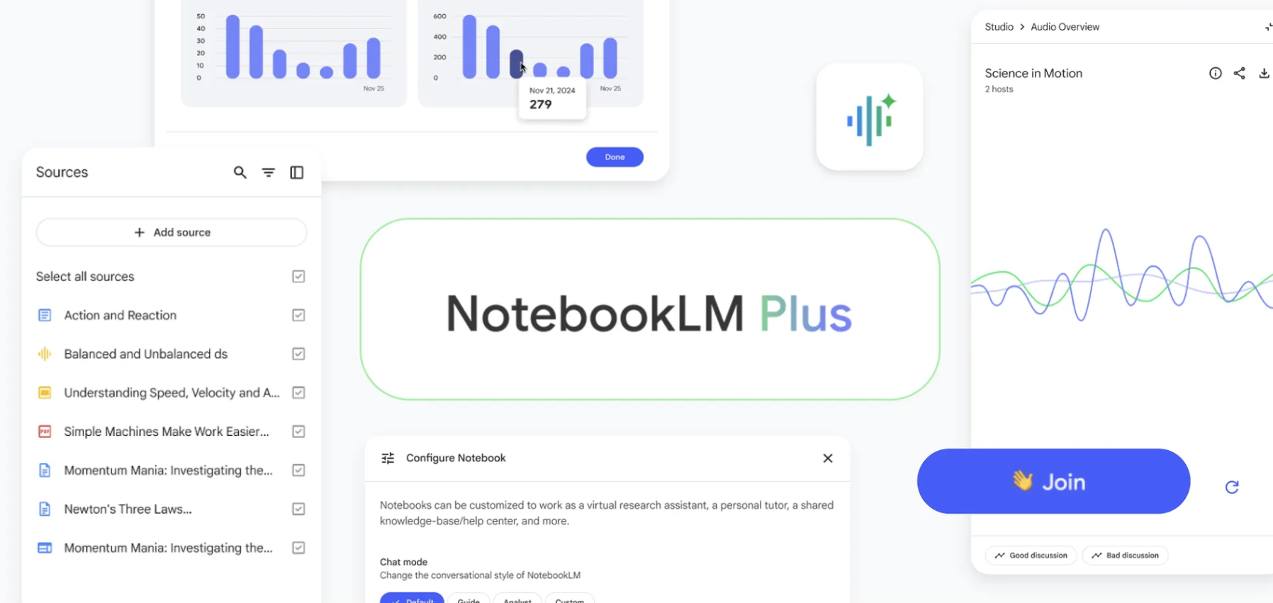 同时,NotebookLM推出高级版本——NotebookLM Plus。附加功能包括:每个笔记本的音频文本转述、笔记本和来源数量增加五倍以上;能够自定义笔记本响应的样式和长度;共享团队笔记本并进行使用分析;以及额外的隐私和安全。