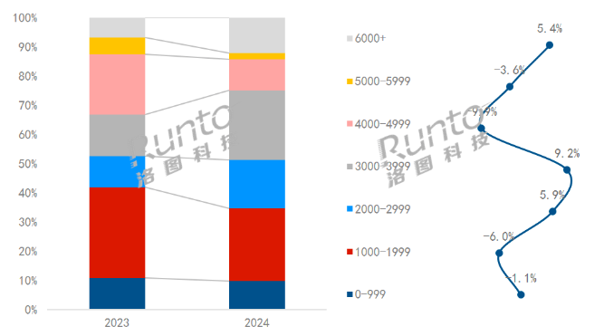 从2024全年来看,低价区间依然占据了市场的主要位置,中高价位产品的份额提升最为明显,高端产品的线上市场份额为12%。
