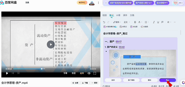 与常见的独立笔记类产品不同,已在百度网盘存储数G学习资料的用户打开视频,AI即可自动生成图文笔记,涵盖例题、解析、大纲、知识点和易混淆点对比、数学公式、图表小结等等。此外,还提供时间戳精准定位,点击瞬间跳转回视频对应位置。其还有提取字幕功能,一键提取老师附近讲的话,还会自动去口语词和加粗重点。
