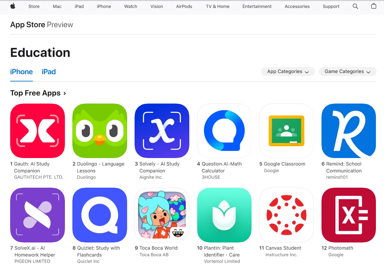 针对海外市场,作业帮此前推出的海外AI应用产品Question.AI,在北美、东南亚等地迅速适应并满足了用户的需求。美国苹果 App Store教育排行榜显示,Question.AI的下载量已经连续一年稳居前五之列,Question.AI在谷歌Play Store也同样位居前列。