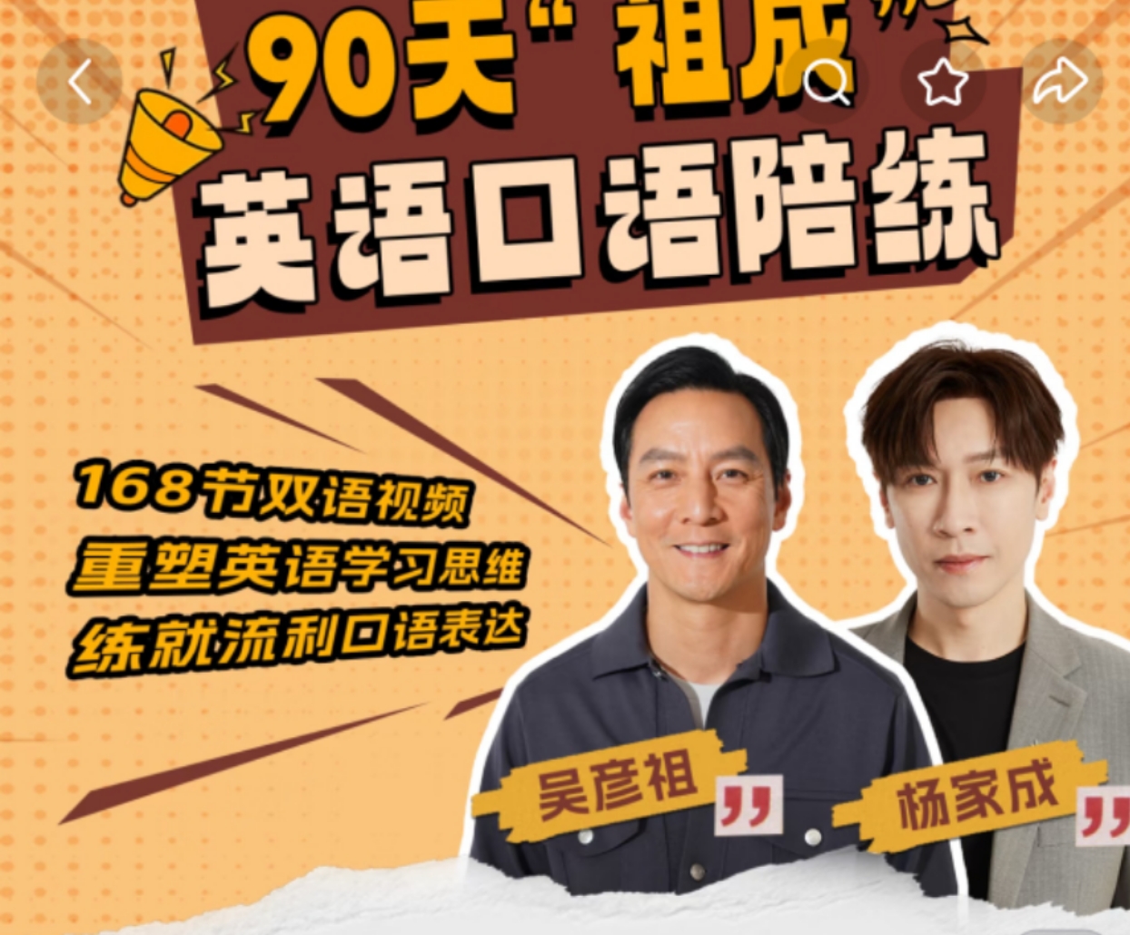 据杨家成介绍:“90天‘祖成’英语课是吴彦祖和我一起研发的全新课程,价格只要398元,就包括购物车中的所有内容:168节双语视频课、30天AI口语陪练、90天真人纠音和吴彦祖签章版口语教材。”