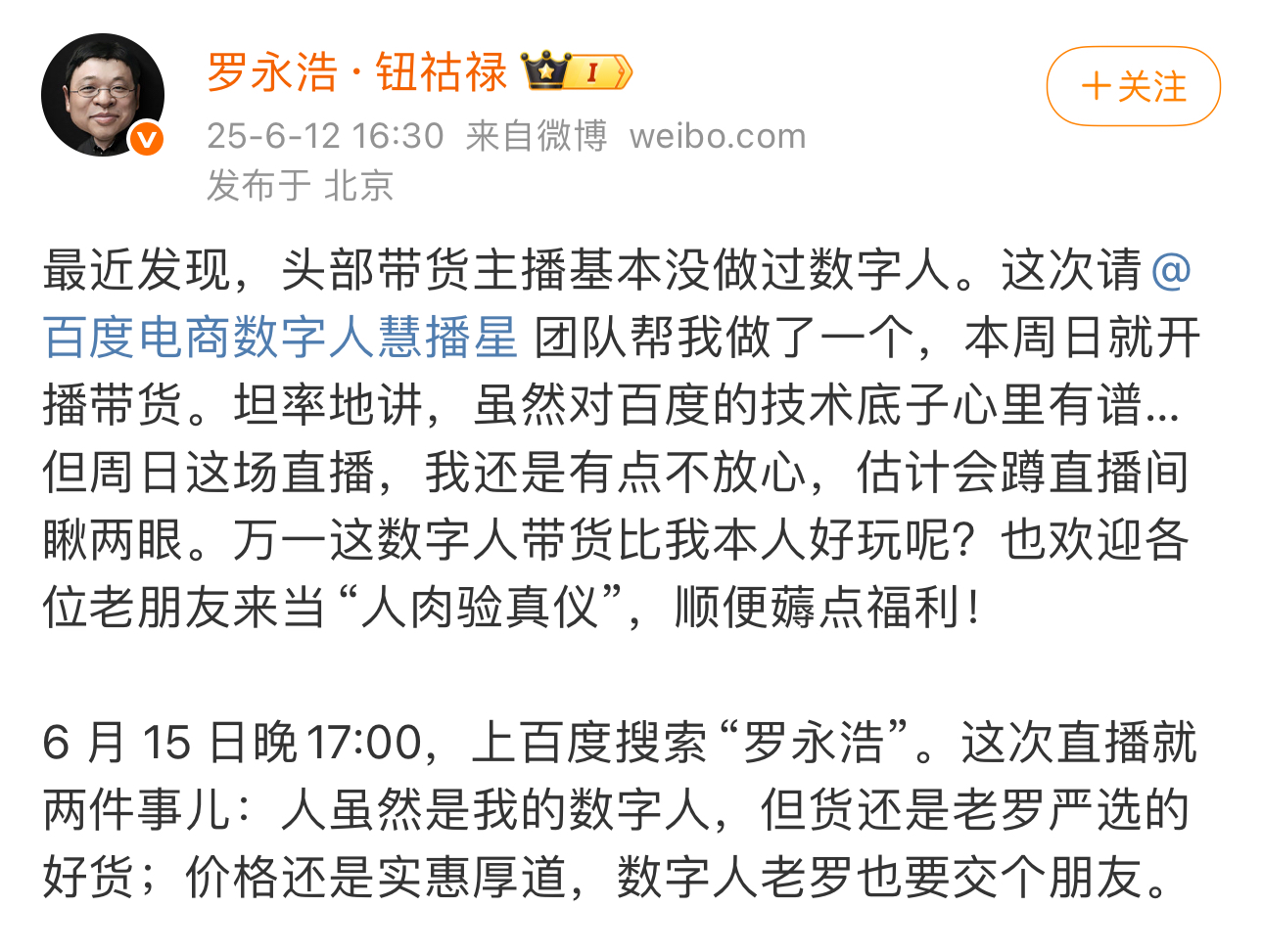 多知6月13日消息,罗永浩于6月12日通过微博宣布,其数字人形象将于6月15日在百度电商平台开启直播带货,并欢迎“老朋友们”届时前来充当“人肉验真仪”,数字人老罗也要交个朋友,引发业界关注。