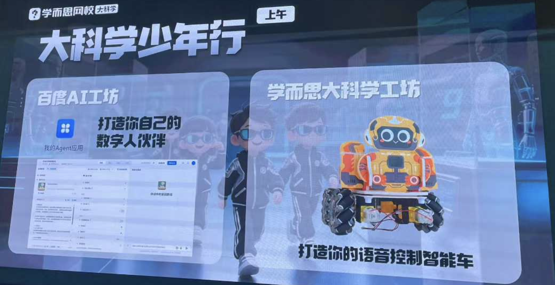 随后,在学而思大科学工作坊,学员们一起讨论AI技术的现状和未来,提出了要让AI技术冲出屏幕,改变现实生活的目标。最终,孩子们用老师准备的材料,每人都成功制作了一辆能够语音控制的麦克纳姆轮智慧小车,通过亲身实践加深了对科学技术和现实应用的理解。