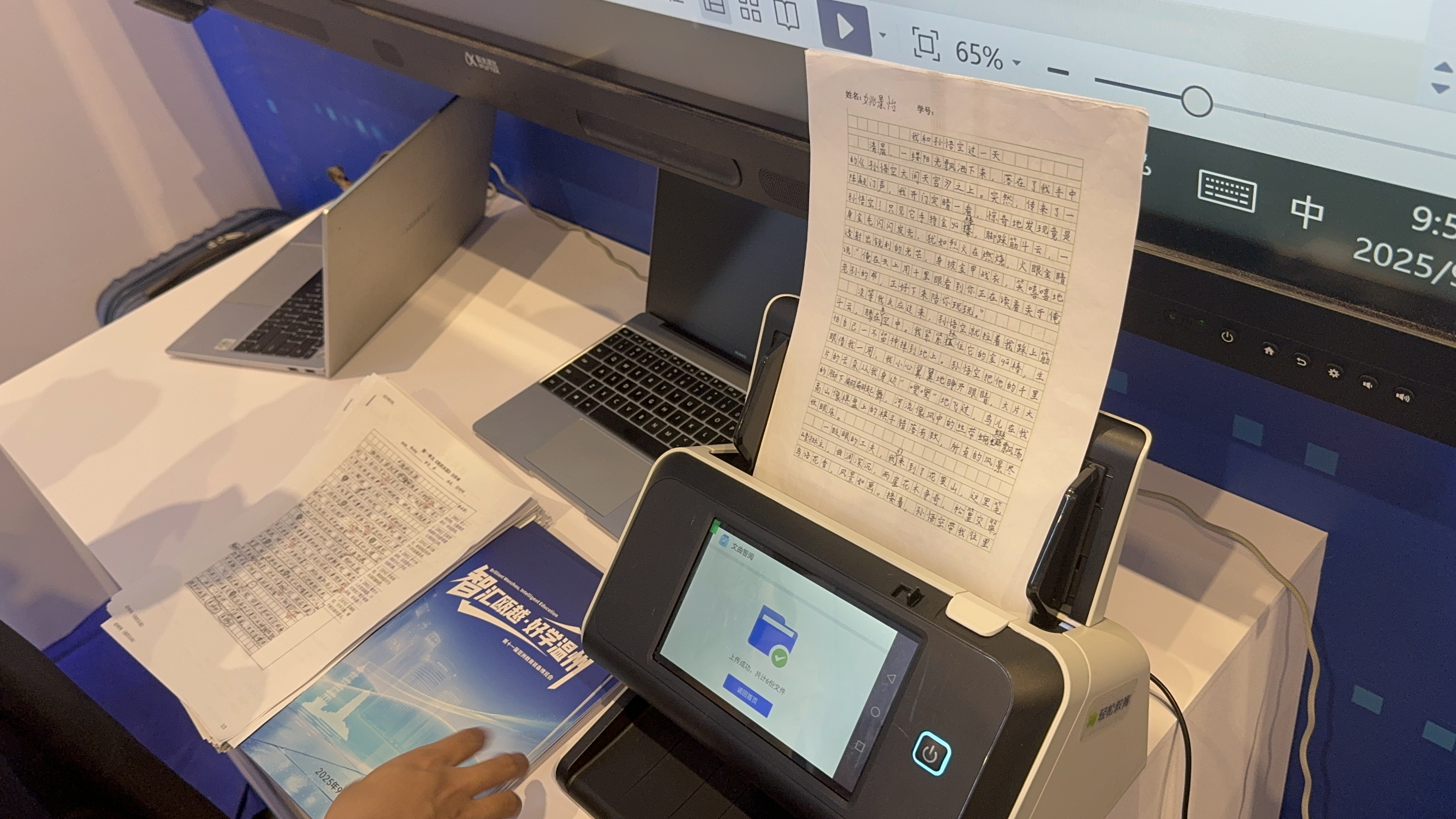 现场也有不止一家AI作文批改,每一个跟AI作文有关的展位都颇具人气。