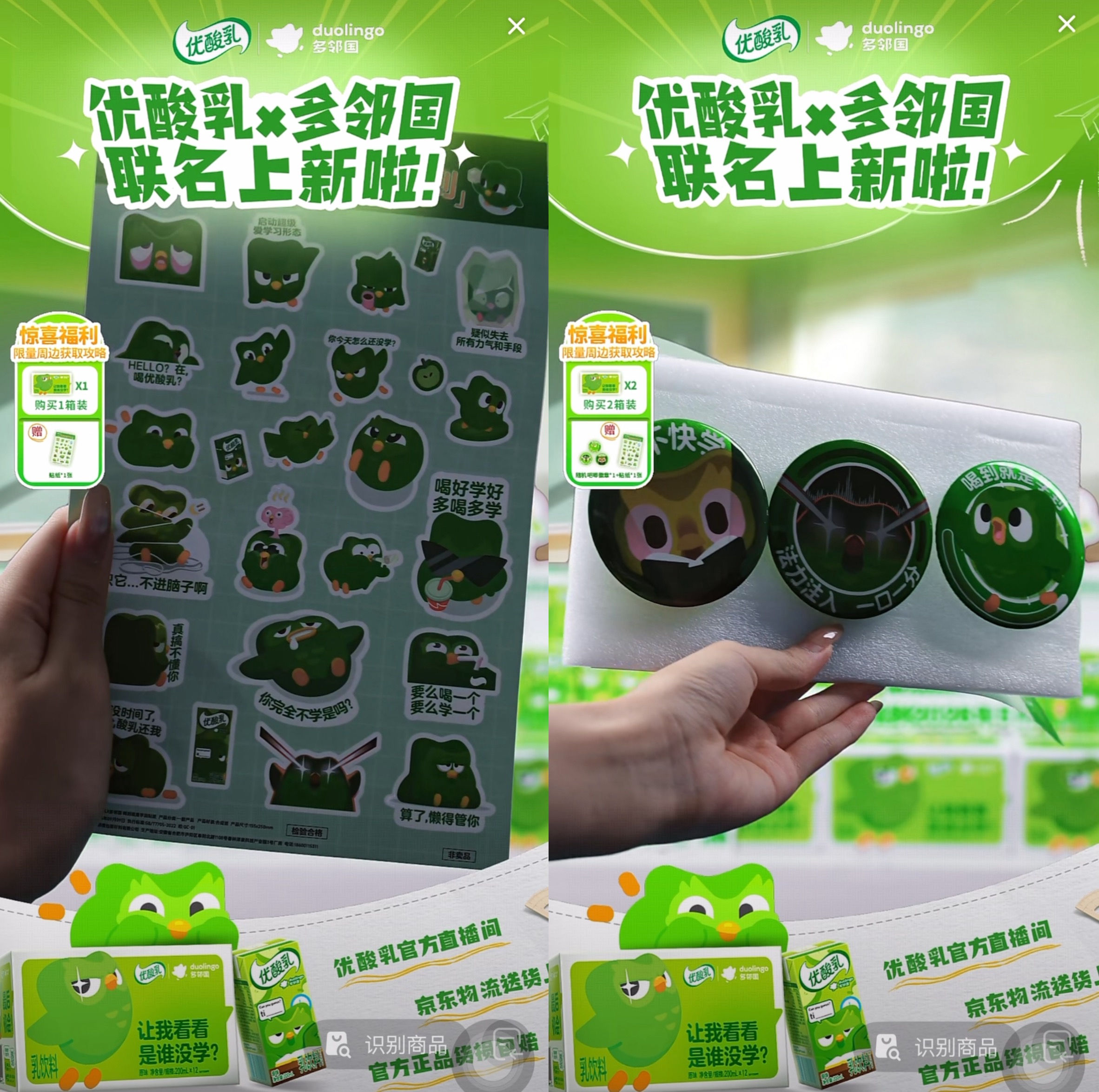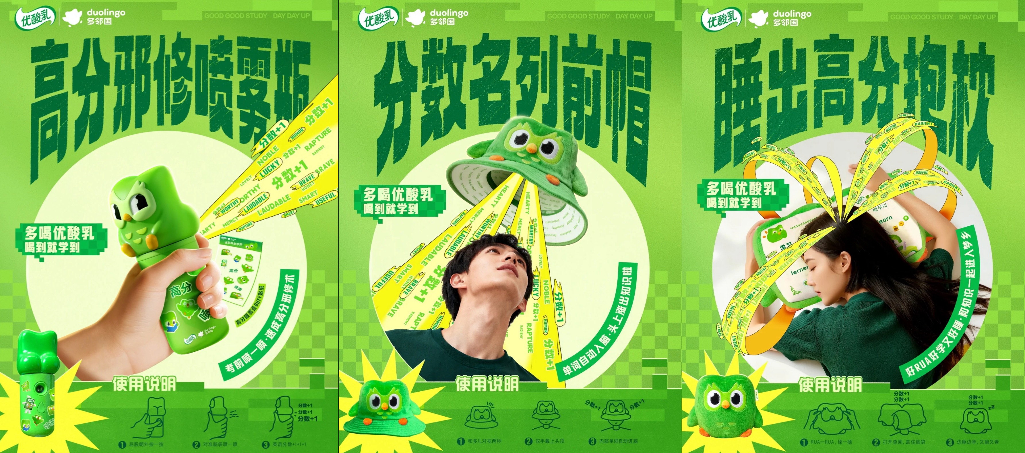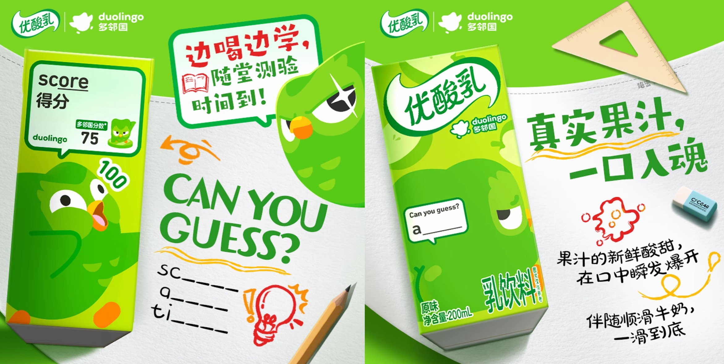 伊利优酸乳选择与多邻国合作,从品牌角度与此前教育企业联名咖啡馆等企业大逻辑基本一致,例如: