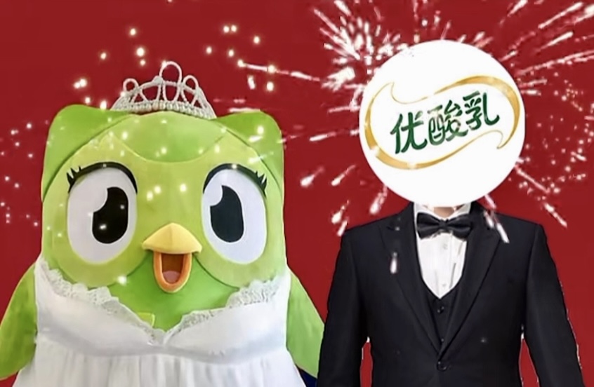 与瑞幸的世纪婚礼到现在刚刚两个月,本周,多邻国与伊利优酸乳官宣牵手——多儿又又又结婚了。