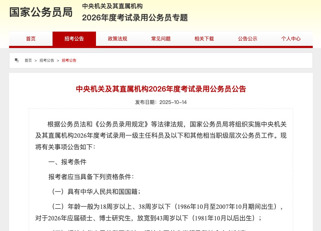 值得关注的是,与往年不同,按照实施渐进式延迟法定退休年龄有关政策要求,本次国考对公务员招录年龄条件作了适当放宽调整,明确年龄要求为——年龄一般为18周岁以上、38周岁以下(1986年10月至2007年10月期间出生),对于2026年应届硕士、博士研究生,放宽到43周岁以下(1981年10月以后出生)。
