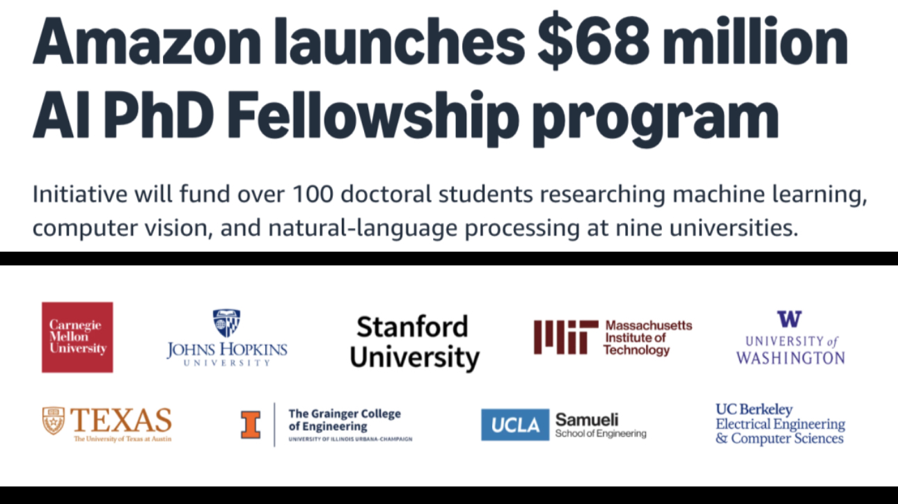 多知10月24日消息,近日,亚马逊公布了一项总金额6800万美金的AI博士奖学金计划,该计划将于未来两年内针对包括卡内基梅隆大学、约翰霍普金斯大学、斯坦福大学、麻省理工学院、加州大学伯克利分校、加州大学洛杉矶分校、伊利诺伊大学厄巴纳-香槟分校、德克萨斯大学奥斯汀分校、华盛顿大学在内共计9所大学的100余名博士生提供研究资金的支持,用于机器学习、计算机视觉和自然语言处理领域的学习。