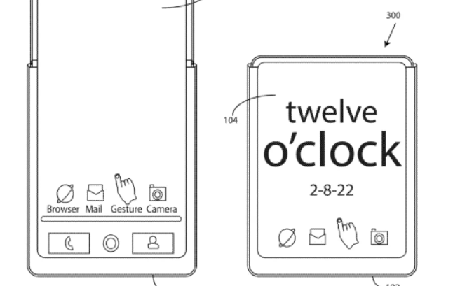 而摩托罗拉得“卷轴拉伸屏”的专利可以一机多用。专利图纸显示,该设备采用柔性可伸缩显示屏,可以配备可调节以适应手腕佩戴的束带,变成智能手表佩戴在手腕上。