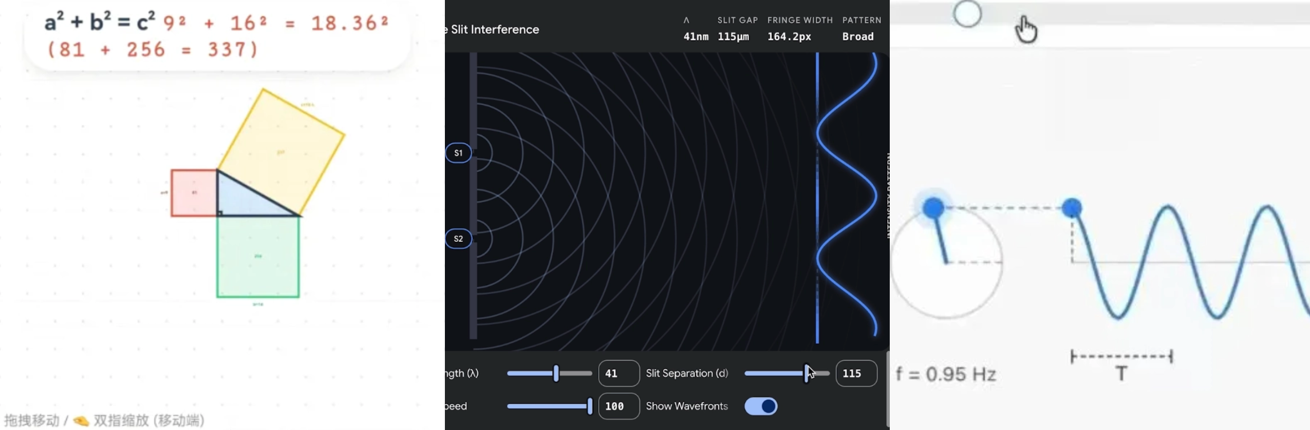 例如可以拖动太阳系,看行星之间的真实距离;也可以顺着黄河一路点下去,了解它流经的城市;甚至可以把分子结构拆开看清内部构成;还可以试试小孔成像的物理原理;调一调参数,看勾股定理的变化是怎么发生的......