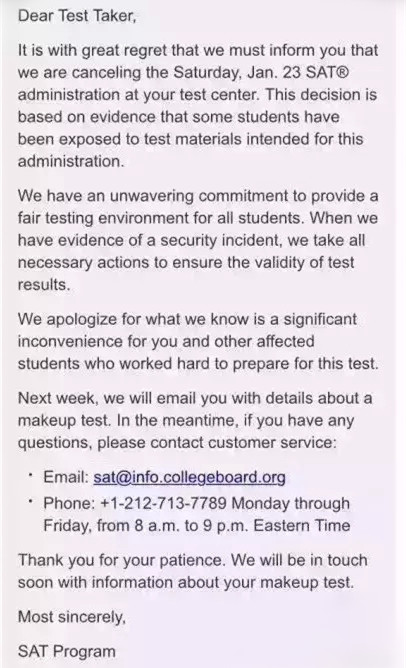 很遗憾的通知你,由于收到确切证据——有部分考生已拿到试题,原定于2016年1月23日即本周日在你所在考点举行的SAT考试取消。