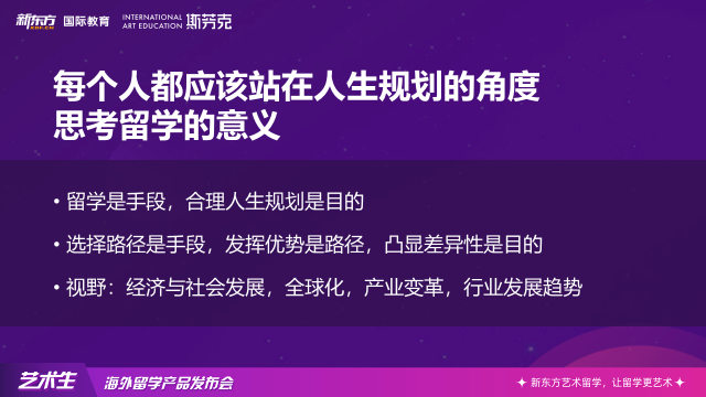 一直以来,艺术升学都是留学行业的一个重要赛道,也是很多学生向往和希冀的学业方向。对于是否选择艺术留学这个路径去留学,刘烁炀指出:“留学是手段,规划人生才是目的,每个人都应该站在人生规划的角度思考留学的意义。”在这个经济社会快速发展,全球化产业化迅速变革的当下,对于艺术留学的选择,并不是当下的一个决定,而应是长远人生规划中的一环。
