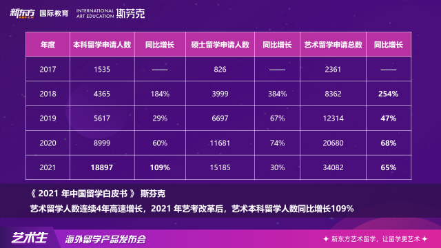 根据《2021年中国留学白皮书》数据显示:艺术留学申请人数连续4年高速增长,2021 年艺考改革后,艺术本科留学申请人数同比增长109%。