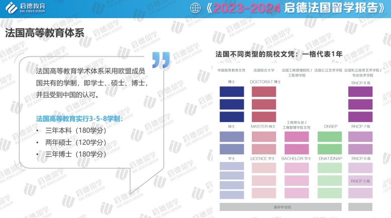 法国高等教育采取LMD学制,即学士(Licence3年), 硕士(Master2年),博士(Doctorat3年)。除了综合性大学以外,法国高等教育体系还包含了高等精英院校,其中以商科领域的高等商学院,及理工科领域的工程师学院最为常见。高等商学院是法国商科教学领域的翘楚,课程涵盖了本硕博三大阶段,法国共有19所高等商学院同时拥有国际三大认证(英国工商管理硕士协会的 AMBA、国际商学院协会的 AACSB、欧洲管理发展基金会的 EQUIS),这在欧洲范围乃至全球范围内都是非常令人瞩目的成绩。