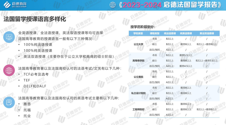 法国高等教育的授课语言一般有纯法语授课、纯英语授课、英法双语授课三种情况,据官方统计,近十年英语授课课程的数量增长迅猛,从2004年的286个增加到目前的1681个,增长了五倍多,大多数院校的要求是英语B2(相当于雅思5.5-6.5)以上。
