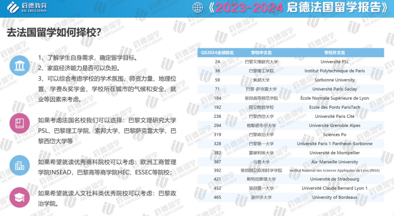 法国不同类型院校学费略有区别。公立大学免学费,只有少量注册费;精英院校收取学费,但有大量奖学金可申请。启德教育建议学生选择法国院校时除了参考综合排名,还可以考虑院校在专业领域的表现,比如QS学科排名、软科世界一流学科排名等。法国名校可以考虑索邦大学、巴黎文理研究大学、萨克雷大学、巴黎西岱大学、巴黎第一大学等,优秀商科院校可以考虑欧洲工商管理学院INSEAD、巴黎HEC商学院、埃塞克高等商学院ESSEC等院校,人文社科类优秀院校可以考虑巴黎政治学院。
