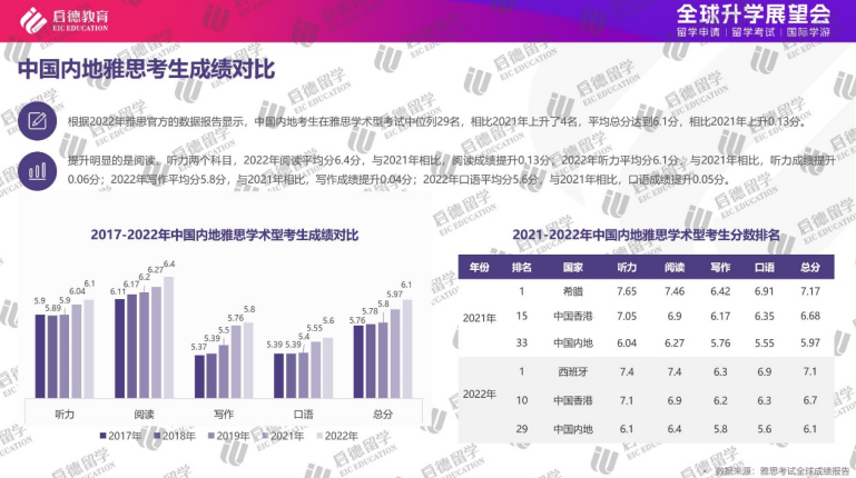 2022年雅思官方的数据报告显示,中国内地考生在雅思学术型考试中位列29名,相比2021年上升了4名,平均总分达到6.1分,相比2021年上升0.13分。提升明显的是阅读、听力科目,2022年阅读平均分6.4分,与2021年相比提升0.13分;听力平均分6.1分,与2021年相比提升0.06分;写作平均分5.8分,与2021年相比提升0.04分;口语平均分5.6分,与2021年相比提升0.05分。启德考培建议学生在准备口语话题素材时,多考虑可合并准备的答题点;在写作方面要积累20000字以上相关话题的阅读,并进行10000字以上写作输出训练。