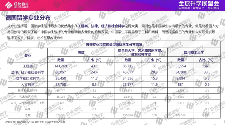 中国香港“大学资助教育委员会”统计数据显示,2022/23学年香港八大非本地生本科就读专业集中在理学科(27%)、商科与管理科(27%)、工程科与科技科(20%)、社会科学科(16%)、文科与人文科学科(7%)。德国《科学大都会2023》报告显示,国际学生就读的前三专业分别为工程类(43.1%)、法律、经济和社会科学(24.4%)、数学和自然科学(11.7%)。