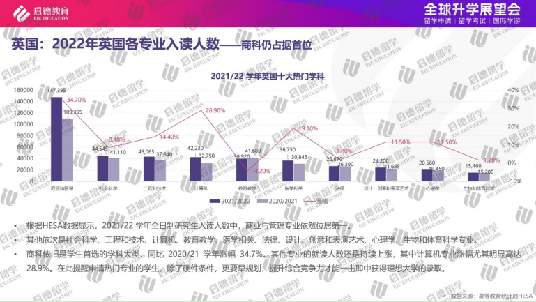 英国高等教育统计局HESA数据显示, 2021/22学年全日制本科生的五大热门专业分别是商业与管理、医学相关、社会科学、创意艺术与设计、工程与技术;全日制研究生的五大热门专业分别是商业与管理、社会科学、工程与技术、计算机、教育与教学。