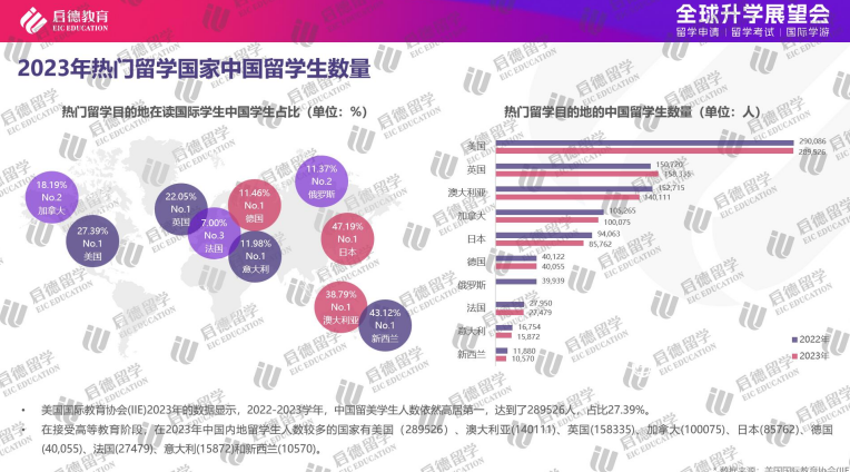 据美国国际教育协会(IIE)不完全统计,2023年中国学生高等教育阶段的热门留学地分别为美国(289526)、英国(158335)、澳大利亚(140111)、加拿大(100075)、日本(85762)、德国(40055)、法国(27479)、意大利(15872)、新西兰(10570)。目前中国仍是美国、英国、德国、澳大利亚、新西兰、日本、意大利等国家的第一大留学生生源国。