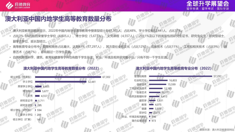 英国高等教育统计局HESA数据显示,2021/22学年中国内地留英学生的本科与研究生人数分别为 62935与88755。另据启德英国留学生调研数据显示,31.8% 的学生希望未来在英国攻读第二硕士,除时间优势外,主要是因为二硕能够收获更高质量的学历,提升院校背景,从而增加就业竞争力。澳大利亚教育部数据显示,2022年中国内地学生中近一半为授课型硕士(67302),四成以上为本科与荣誉学士(59046),博士学位(5677)占比4%。