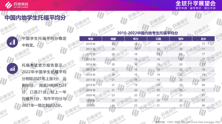 托福考试官方报告显示,2022年中国内地学生托福平均分相较2021年上涨3分,达到90分, 阅读24分和听力23分,口语21分,较上一年均提升1分,写作平均分与2021年一致达到近22分。从2023年7月26日起,托福考试的时长由3小时缩短至2小时内,题量减少,考试题型也有所变化,写作部分由独立写作变为学术讨论写作。