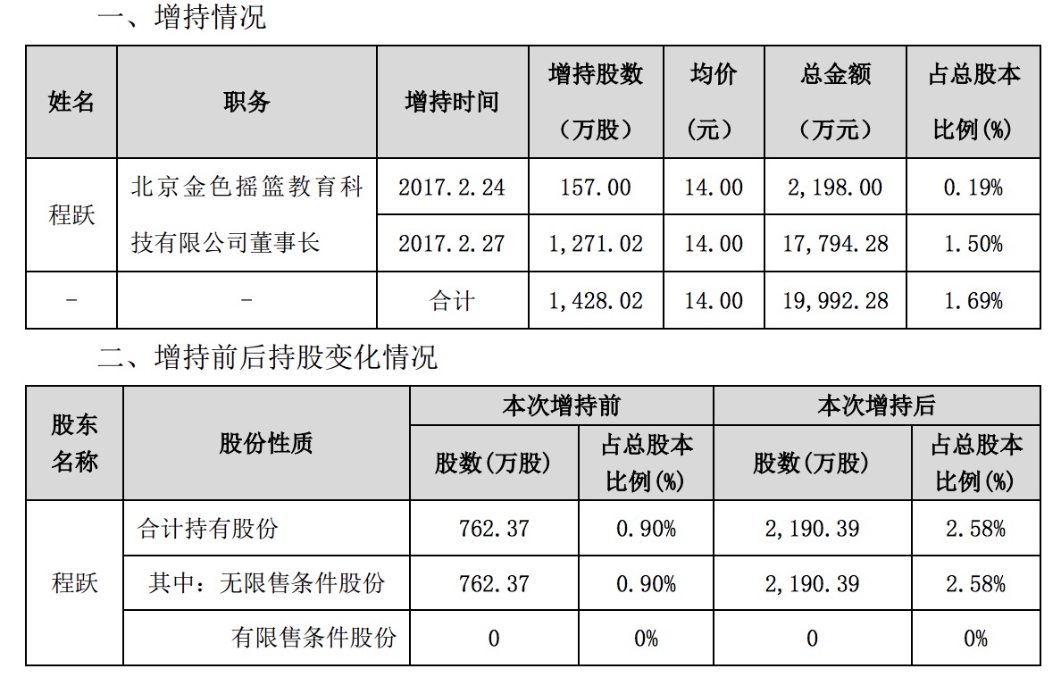 多知网2月28日消息,今日,威创集团发布公告称,公司全资子公司北京金色摇篮教育科技有限公司董事长程跃使用人民币2亿元增持公司股份,其中已使用 19992.28 万元以大宗交易方式购买了1428.02 万股公司股份,成交价为 14.00 元/股,扣除交易佣金后约 2.7 万元的资金余额程跃将于 2017 年 5 月 22 日前通过大宗交易或二级市场购买等法律法规允许的方式购买公司股份。