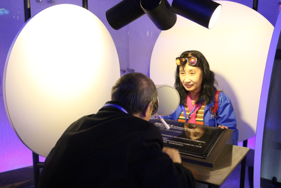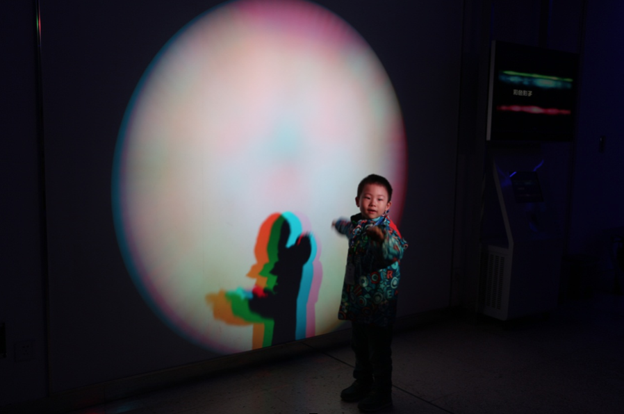 每个参观的展位,都可以让体验者参与到其中进行感受。彩色影子,反应的是光的三原色,通常,我们是挡住全部三种光线,就会得到黑色的影子。