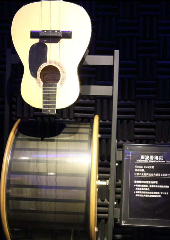 拨动吉他弦,同时转动旋转鼓,可以看到波纹的形状,随着音调的变化,波纹也会有所不同。